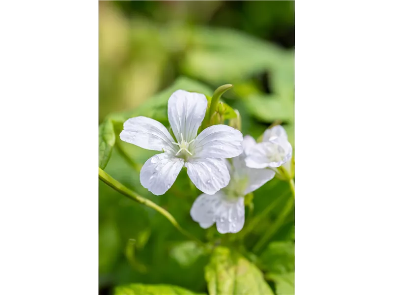 Der Knotige Storchschnabel 'Silverwood (Geranium nodosum) ist eine aufrechte, ausläuferbildende Staude, die von Mai bis August weisse, schalenförmige Blüten bildet. Seine rundlichen, gelappten Blätter sind hellgrün. An einem halbschattigen bis schattigen Standort mit durchlässigem, humosem, lockerem Boden erreicht er gewöhnlich eine Höhe von ca. 30 cm und wird ca. 30 cm breit. Der Knotige Storchschnabel 'Silverwood ist gut frostverträglich.