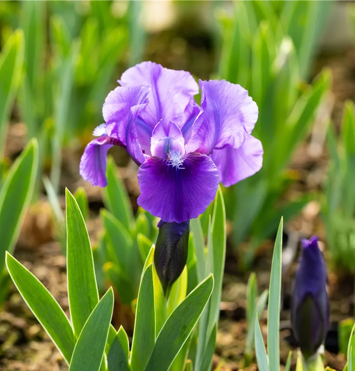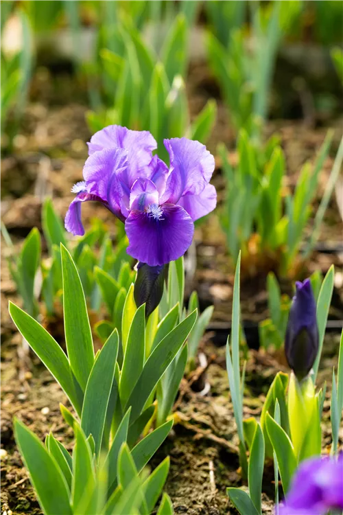 Iris barbata-nana 'Truly' forme des fleurs violettes, à partir de mai.